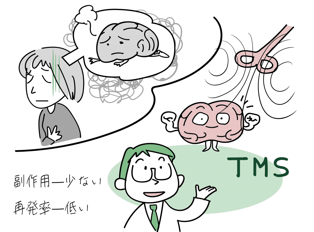 特にお薬の治療を試行錯誤しても良くならない場合は、メカニズムが異なるTMSは有効な治療選択肢の一つになります。